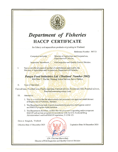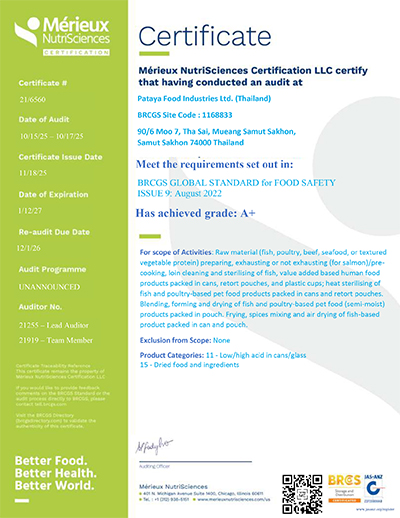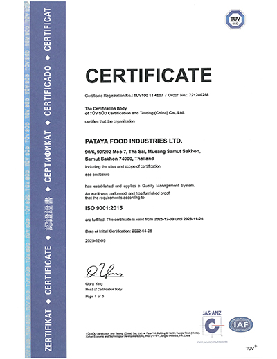 With commitment and improvement throughout 40 years of its operations, PFG - Pataya Food Group has been acknowledged on its international standard from accredited institutes both locally and internationally such as GMP , HACCP , BRC , IFS , ISO 22000 , ISO 9001 , Orthodox Union, MSC and Halal as an assurance on PFG - Pataya Food Group’s commitment to quality